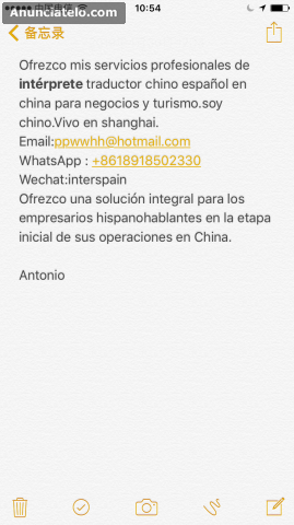 Soy chino, trabajo como Intérprete traductor chino español en China .vivo en Shanghai . dedicado a la Interpretación y Traducción , guía para los hispanohablantes. Tengo una amplia experiencia de traducciones técnicas .ofrezco: Servicios comerciales de yiwu .Traducciones , Reserva de hotel, Recogida y despedida a Aeropuertos Estaciones,Verificación de las empresas y fabricantes ,Servicios turísticos ,Acompañamiento a ferias y fabricas. etc.