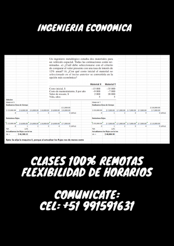 Se dicta clases remotas del curso de ingenieria económica, las clases son 100% remotas con flexibilidad de horarios. Nuestro objetivo es que aprendas a plantear y resolver los problemas del curso.