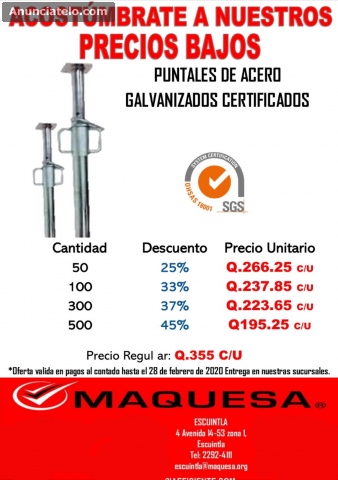 Puntales Galvanizados visitanos en 4 avenida 14-53 zona 1 escuintla o llamanos al 22924111 o al 42248067 Recuerda que tenemos grandes ofertas sera un gusto poderte atender MAQUESA PRECIOS BAJOS: