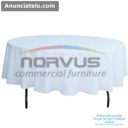 Invierte en manteles para complementar la decoracion de tus mesas banqueteras. Manteles economicos de tela con caida a mitad de pata, para uso en interior y exterior sin problema.