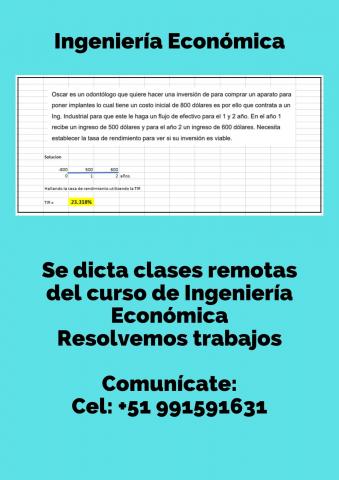 Se dicta clases del curso de Ingeniería Economica, las clases son remotas y con flexibilidad de horarios. Los temas a tratar son los siguientes.