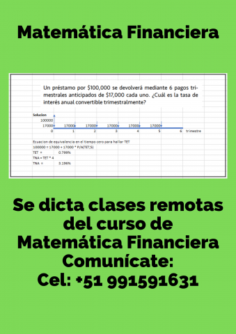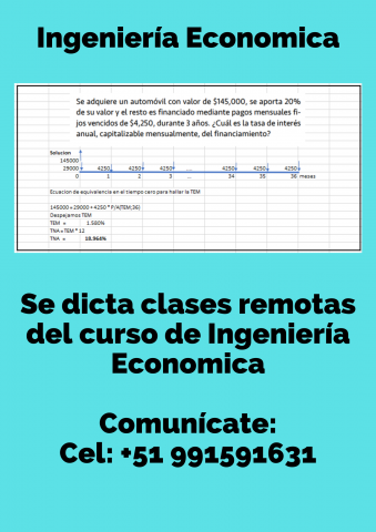 Se dicta clases del curso de ingeniería económica, las clases son remotas con flexibilidad de horarios. Comunícate al numero +51 991591631