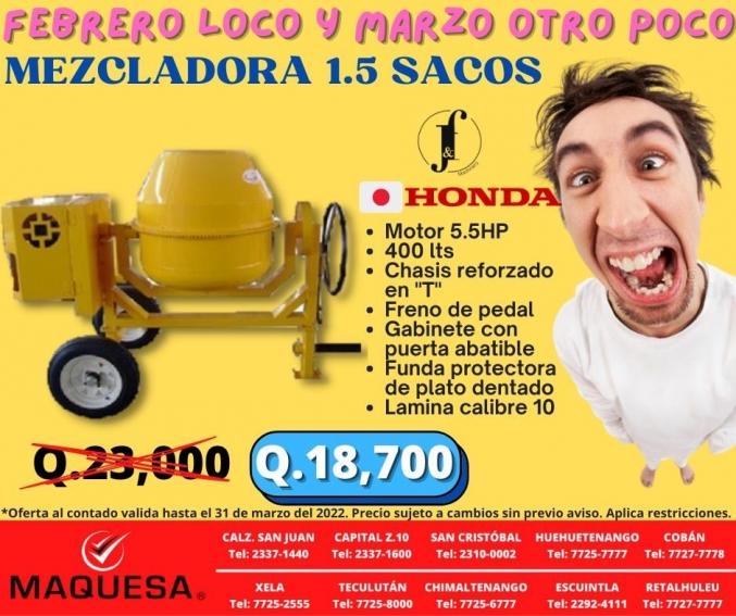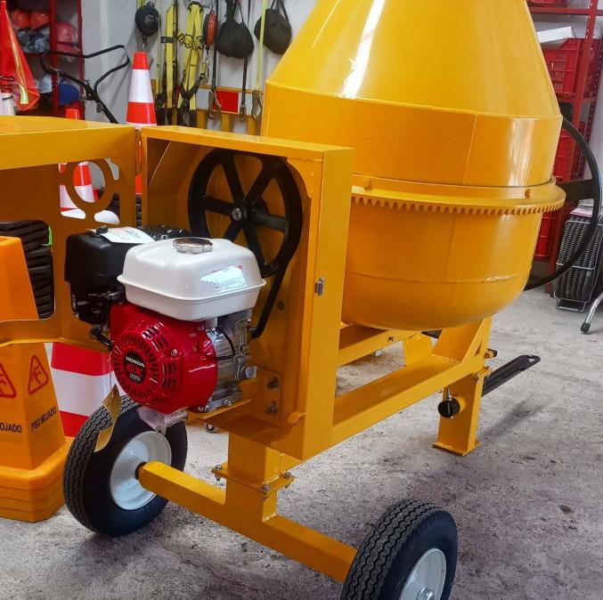 MEZCLADORAS DE 4OO LITROS, 1.5 SACOS, MOTOR HONDA DE 5.5 HP, FRENO DE PEDAL Y CHASIS EN T.