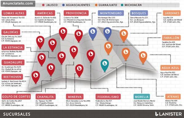 Tenemos 20 sucursales situadas en Guadalajara, Zapopan, Aguascalientes, León y Morelia.