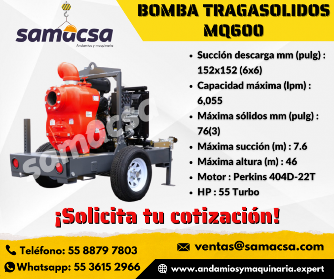 La función principal de una bomba tragasólidos MQ600 es ayudar a movilizar grandes cantidades de agua "sucia", o con sólidos, de una ubicación a otra, más lejana, horizontal o verticalmente.