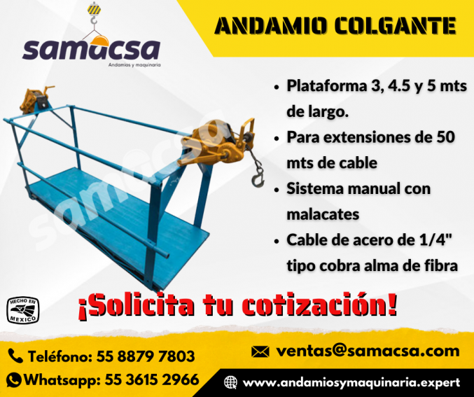 para construcción. Esta hamaca o andamio colgante es izada a través de un sistema de malacates manuales por los cuales sube, baja y se mantiene estable a la altura deseada.