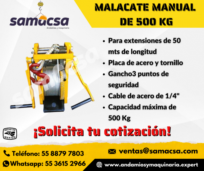 Los andamios colgantes o hamacas son izadas a través de un sistema de malacates manuales por los cuales sube y baja y permite estabilidad a la altura deseada. Cuenta con 3 puntos de seguridad, con capacidad de 500 kg y extensiones de 50 mts de longitud.