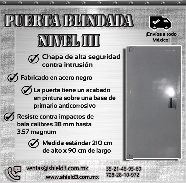 Shield3 tiene para ti puertas con blindaje resistentes a calibres de armas, fabricadas bajo estrictas normas Internacionales y Nacionales balísticas.