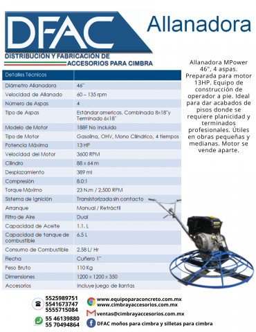 Allanadora MPower, 4 aspas, preparada para motor 13HP. Equipo de construcción de operador a pie. Ideal para dar acabados de pisos donde se requiere planicidad y terminados profesionales, cumplen la función de alisar y nivelar superficies de concreto. Útiles en obras pequeñas y medianas. En DFAC también contamos con andamios, plataformas llantas para andamio, maquinaria ligera, revolvedoras, vibrador para concreto, cortadoras y más. ¡Entrega inmediata! ¡Entrega en toda la república! Tenemos stock, la mejor calidad al mejor precio. Búscanos como DFAC. En DFAC te podemos facturar somos una empresa establecida. Somos tu mejor opción, te ofrecemos calidad y seguridad en cada uno de nuestros productos.
