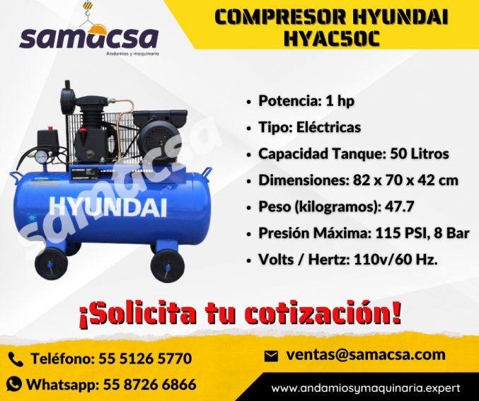 Compresor marca HYUNDAI con potencia de 2 hp. Ideales para sopletear, pintar, barnizar, uso en talleres y vulcanizadoras.
