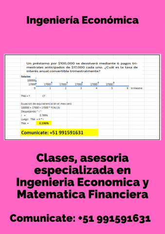 Asesoría especializada en los cursos de Ingeniería económica, matemática financiera. Te acompaño en el desarrollo del curso para que lo puedas pasar en el primer intento. Puedes hacerme consultas al número: +51 991591631